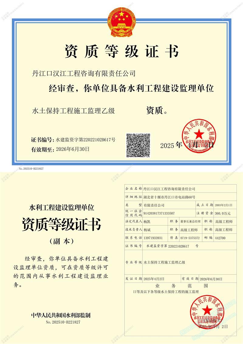 丹江口漢江工程咨詢有限責(zé)任公司 (原漢江綜合開(kāi)發(fā)公司水利水電監(jiān)理中心)成立于 1989年3月,1993年6月經(jīng)水利部審批成為首批注冊(cè)監(jiān)理單位 (隸屬于長(zhǎng)江水利委員會(huì)), 注冊(cè)資本 360萬(wàn)元 。公司位于湖北省十堰市丹江口市電站路。公司目前擁有水利部頒發(fā)的 水利工程施工監(jiān)理甲級(jí) 、 水土保持工程施工監(jiān)理 乙 級(jí) 資質(zhì) ;住建部頒發(fā)的 房屋建筑 、 市政公用工程監(jiān)理 乙 級(jí)資質(zhì) 。 可獨(dú)立承擔(dān) 各類水利水電工程 、 一般工業(yè)與民用建筑工程監(jiān)理 , 土地整治 , 招標(biāo)代理 、 技術(shù)咨詢 等業(yè)務(wù)。公司實(shí)行董事會(huì)領(lǐng)導(dǎo)下的總經(jīng)理負(fù)責(zé)制,下設(shè)辦公室、經(jīng)營(yíng)部、財(cái)務(wù)部、工程技術(shù)部等職能部門。……